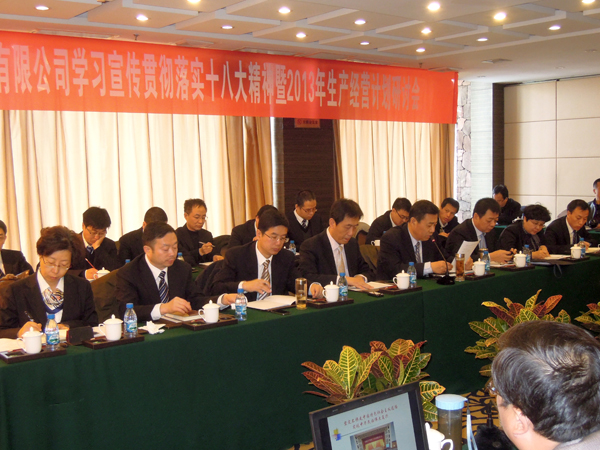 2012年12月6日-7日,公司学习宣传贯彻落实十八大会议精神暨2013年生产经营计划研讨会在西安华清爱琴海国际酒店三楼会议室顺利召开。公司中层以上领导干部、各下属公司高管及党支部书记共45人参加了此次会议。