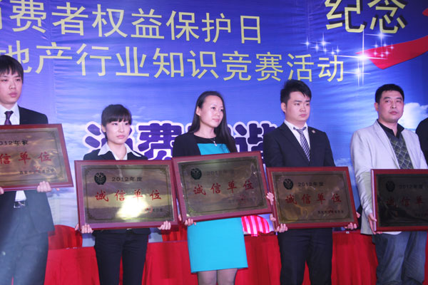 2013年3月13日,由西安市工商行政管理局双生分局、西安市消费者协会双生分会联合西安电视台《新居时代》及多家媒体推出的“3.15国际消费者权益保护日西安首届房地产行业知识竞赛活动”在西安绿地笔克国际会展中心隆重举行。西安市消协秘书长、市工商局消保处处长、市工商局12315中心主任、市工商局法规处处长、市工商局法规处副处长、工商双生分局党委书记、局长以及双生分局等领导出席了本次活动。会上公司以诚信经营和高度的社会责任感被评为“2012年度诚信单位”,并被授予了荣誉奖牌。