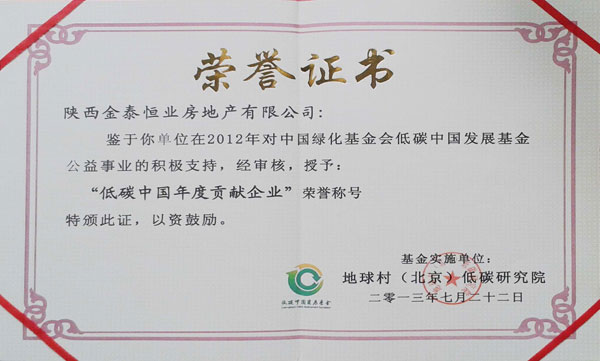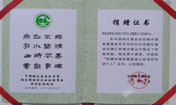 8月7日,由中国绿化基金会、地球村低碳研究院联合举办的低碳养老公益基金启动暨2013促进社区低碳化公益行动仪式在北京全国政协礼堂举行。会上,陕西金泰恒业房地产有限公司积极支持并参与中国绿化基金会低碳中国发展基金公益事业,被授予了2012年度“低碳中国年度贡献企业”殊荣,公司董事长马亚鹏先生被授予“低碳中国发展基金公益项目先进个人”荣誉。