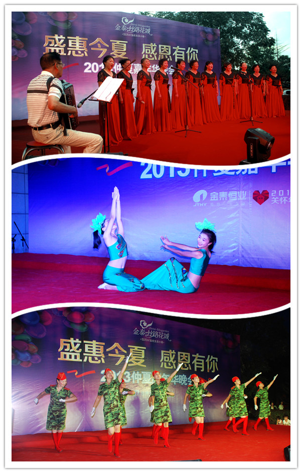 8月31日晚,金泰•丝路花城售楼部中心广场人潮涌动,座无虚席。2013年业主答谢晚会如期盛启,数百位新老业主及其他社区的业主朋友齐聚一堂,共同见证了这一美好时刻。区别于传统的礼品答谢、晚宴答谢,此次活动,金泰•丝路花城别出心裁,精心准备了一场集歌舞、戏曲等多种文艺节目为一体的视听盛宴,倾献新老业主。