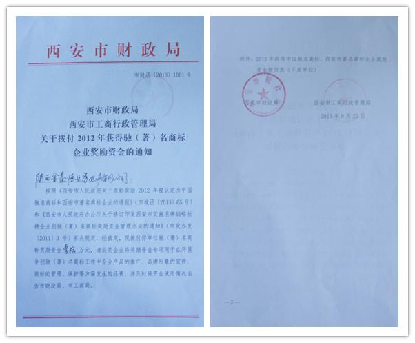 公司“金泰恒业”商标于2012年10月与12月分别经西安市和陕西省著名商标认定委员会全体会议审查通过,并经西安市工商行政管理局和陕西省工商行政管理局批准,被认定为西安市著名商标和陕西省著名商标。近日正式获得了西安市财政局、西安市工商行政管理局关于拨付2012年获得驰(著)名商标的企业专项奖励资金10万元,扶持公司实施开展品牌建设。