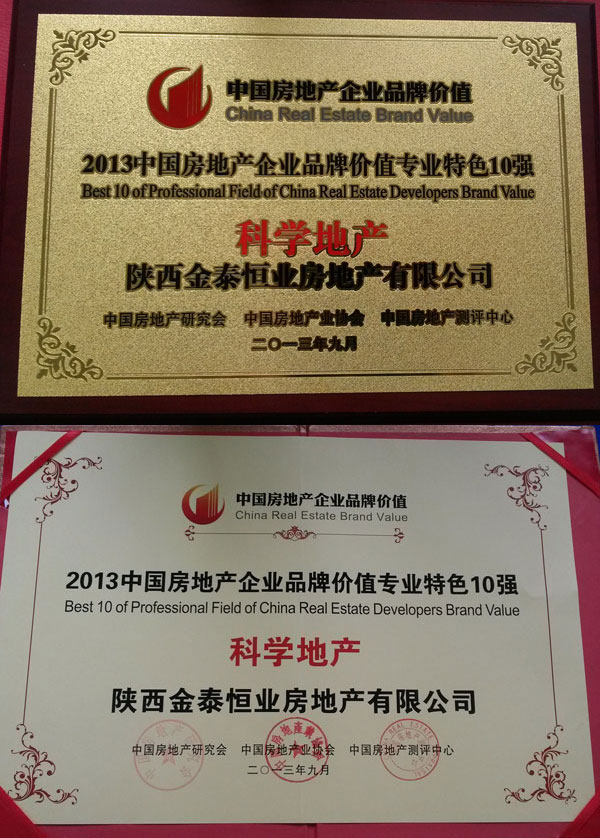 2013年9月17日,北京国贸中心,在2013中国房地产品牌价值测评成果发布会上,陕西金泰恒业房地产有限公司一举荣获“2013中国房地产开发企业品牌价值西北10强(第五位)”及“2013中国房地产开发企业品牌价值专业特色10强(科学地产)”双项殊荣。公司副总经理詹望代表公司出席了发布会并上台领奖。