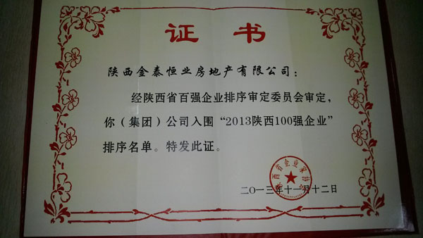 2013年12月17日,由陕西省企业家协会主办、省金融办、发改委、工信厅、商务厅、国资委、统计局等部门协办的“2013陕西百强企业暨第五届陕西省优秀企业家发布会”在西安陕西止园饭店大礼堂召开,陕西金泰恒业房地产有限公司凭借综合实力位列98名,连续两年入围“陕西100强企业”行列。