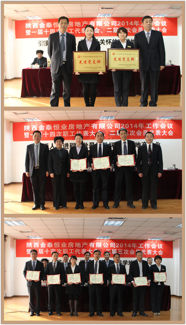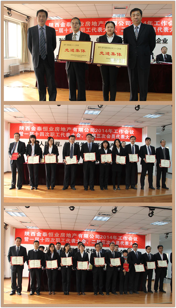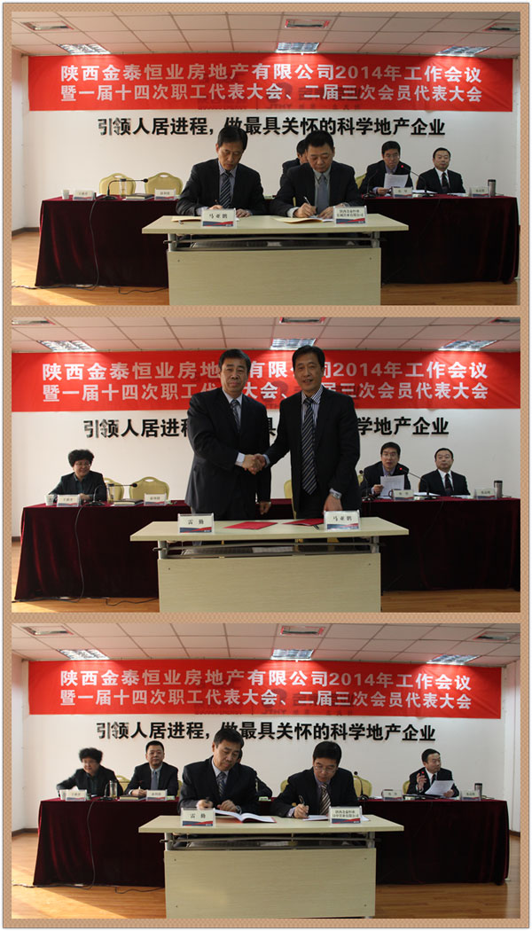 元月27日,陕西金泰恒业房地产有限公司2014年工作会议暨一届十四次职工代表大会、二届三次会员代表大会召开,公司领导班子、本部及各控股公司中层以上管理人员、外派人员、职工代表、工会会员代表共计132人参加了会议。会议分别听取审议了张高明主席作的2013年工会工作报告、赵利捷总经理代表公司经营班子作的题为《转变作风求实效 凝心聚力谋发展 为完成全年目标任务而共同奋斗》的工作报告。《报告》从市场营销、项目建设、集团化管控、财务管理、品牌建设、物业管理、安全生产、党建工会八个方面全面总结了公司2013年工作,客观分析了当前最新形势、公司发展的现状、存在的问题和不足,确立了2014年“提速发展年”和“管理提升年”的两大主题,明确了2014年工作思路和完成任务的十一项保证措施。王雅萍副总下达了2014年重点工作计划,党委书记雷勤传达了集团公司2014年工作会议精神,分别签订了《2014年度资产经营与项目建设目标责任书》、《2014年度党风廉政建设责任书》、《2014年度安全生产责任书》,表彰了先进。