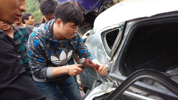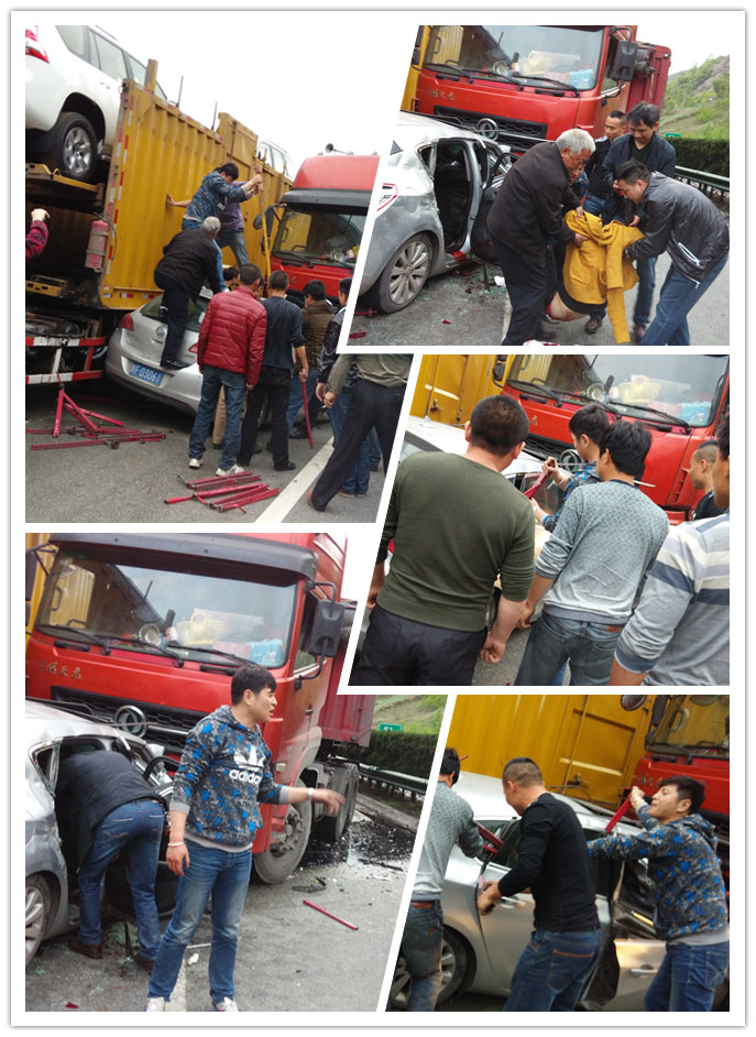 情况紧急,来不及多想,公司驾驶员李松江迅速将车停到紧急停车道,一边快速拨打110、120报警电话,请求最近的医院派救护车前来救援。一边在司机李松江的组织带领下将车内受伤人员抬离被撞车辆,想办法止血。其他人员疏导交通、捡拾碎片。当时,小卧车内共有乘客3人,副驾驶座一名男子似乎已当场死亡,后座另一名男子伤势非常严重,一条腿卡在车内后驾驶座,公司驾驶员李松江不顾自己手已划伤,与大家一起努力撬开车门和车内座位,奋力将人抬出,但经确认已死亡。此时天色阴沉,在场人员表情凝重,几条宝贵的生命就这样瞬间逝去!真是车祸猛于虎也!