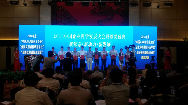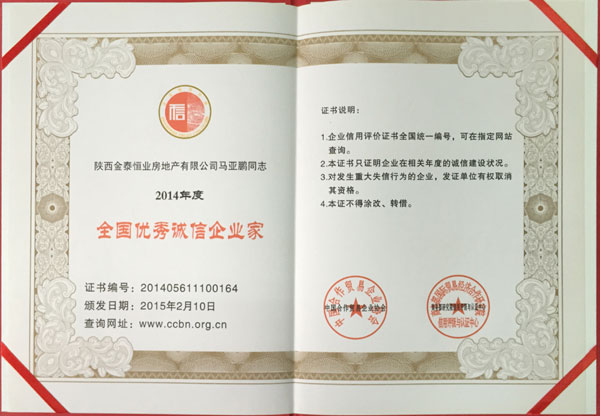 8月16日,在由中国合作贸易企业协会、商务部研究院信用评级与认证中心、中国企业改革与发展研究会、中国企业信用评价中心联合举办的2015中国企业科学发展大会暨颁奖盛典上,通过研究分析、科学评估、严格评定,陕西金泰恒业房地产有限公司被评定为“中国AAA级信用企业”、马亚鹏董事长被授“2014年度全国优秀诚信企业家”称号。