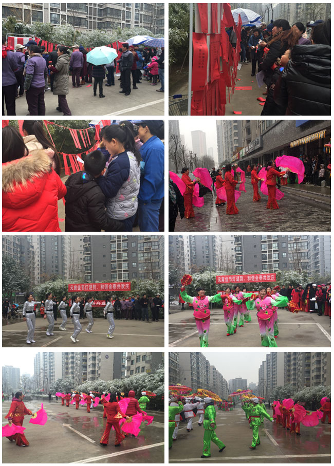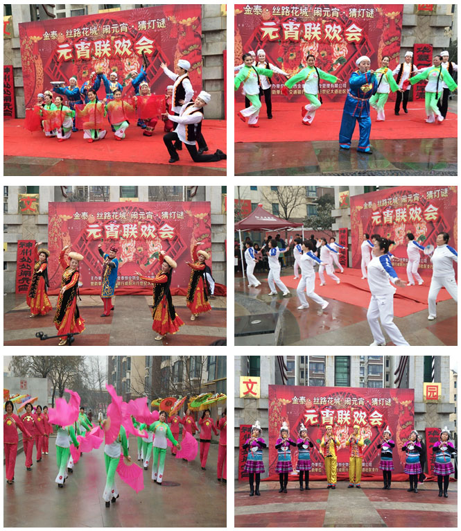 金泰・丝路花城物业服务中心于2月21日下午14:00,在翔鹤广场举办了2016年第一场别开生面的“闹元宵・猜灯谜”联欢会。欢快的秧歌伴随着吉祥的瑞雪,在金泰•丝路花城物业服务中心主任王晓东的祝福声中拉开了序幕。由金泰•丝路花城艺术团的麻辣舞蹈队带来的舞蹈《陕西人》,引来了数百位业主的围观及阵阵掌声与欢呼声。本次元宵联欢会除了舞蹈《甜蜜蜜》、新疆舞、独唱《请你喝一杯下马酒》、《敢问路在何方》、葫芦丝合奏、柔力球表演、太极刀表演、秦腔选段《梁秋燕》等节目精彩丰呈。