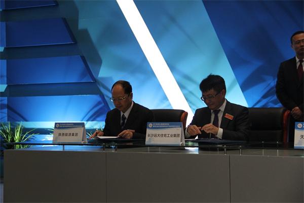 陕西能源集团有限公司总经理宋老虎与长沙远大住宅工业集团股份有限公司董事长张剑分别代表陕西能源集团有限公司和远大住工签署了建筑产业化项目合作协议。陕西省省委常委、宣传部部长梁桂;陕西省人大常委会副主任李晓东等主要领导登台鉴签。