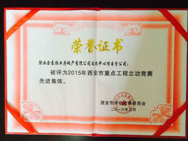 5月19日,金泰恒业文化中心项目分公司被评为2015年西安市重点工程立功竞赛先进集体,西安市劳动竞赛委员会为文化中心颁发了荣誉证书及奖牌。