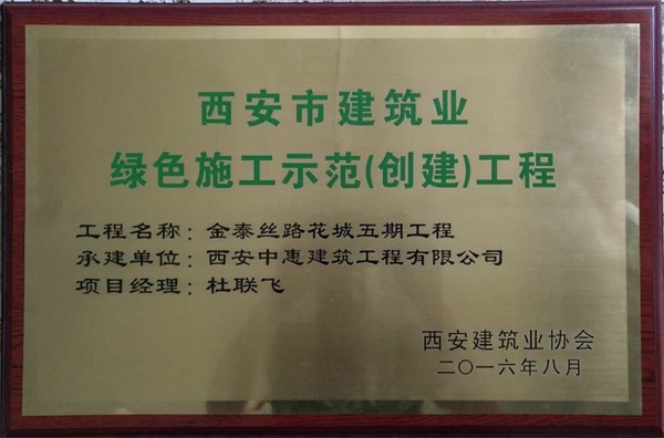 8月30日,经陕西省建筑业协会专家组审核、评议及公示,金泰恒业公司丝路花城五期工程成功通过“2016年度上半年陕西省建筑业绿色施工示范工程”立项授牌。