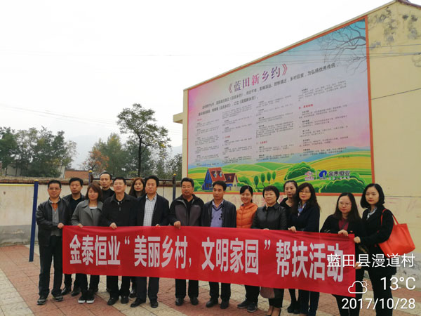 为加强农村精神文明建设,提升农民文明素质和农村文明程度,培育以社会主义核心价值观为核心的新民风新风尚,2017年10月28日,金泰恒业走进蓝田县九间房镇漫道村,开展“美丽乡村,文明家园”帮扶活动。