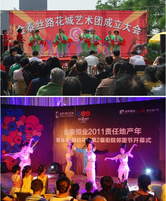 勿庸置疑,丰富多彩的社区文化活动,营造了金泰恒业独特的社区文化。据了解,在丝路花城和假日花城均成立了业主艺术团,包括合唱团、舞蹈队、健身队、腰鼓队、太极队、空竹队等艺术团队,而社区篮球队、羽毛球队、乒乓球队等也都在积极筹备中。社区艺术团体的组建,不仅增强小区业主凝聚力,丰富业主业余文化生活,拉近小区业主与金泰恒业的距离,对于更好地创建文明和谐社区有着重要的意义。