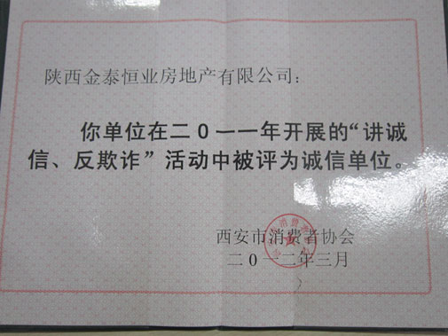 2012年3月12日,由西安市消费者协会、西安市电视台、西安市工商局双生分局主办的“西安房地产行业2012年3•15晚会”在西安曲江宾馆千人 大礼堂隆重举行。会上,陕西金泰恒业房地产有限公司以诚信经营和高度的社会责任感被消费者协会评为“2011年度诚信单位”,并被授予了荣誉证书和奖牌。