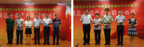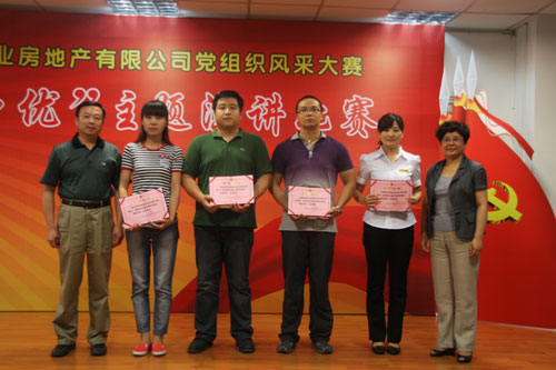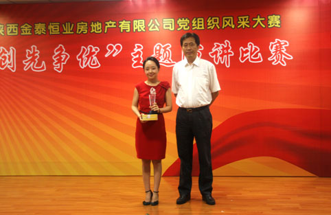 比赛现场气氛热烈,高潮迭起,掌声不断。最终综合办公室选手张皎月以反映金泰恒业人艰苦创业、无私奉献精神为题的《党旗飘扬,青春闪光》荣获一等奖;综合办公室王铁刚、杨明丽双人组合,通过反映综合办公室人员在平凡的岗位上,坚持把平凡的事迹做好为题的《“创先争优”就在你我身边》、金泰物业公司的魏伟作为基层保安中的一员,用危难时刻,冲锋在前,确保万家平安的精神演讲的《在党的培养下成长》和金泰物业公司保洁员薛碧玲以女性特有的细心和柔美,把保洁班全体员工不怕苦、不怕脏、不怕累的精神演讲的《用心谱写金泰物业美好的明天》分别获得了二等奖;陕西文化中心分公司何丁、耿婷,丝路花城项目公司马飞,公司项目拓展部杭伟分别获得三等奖。