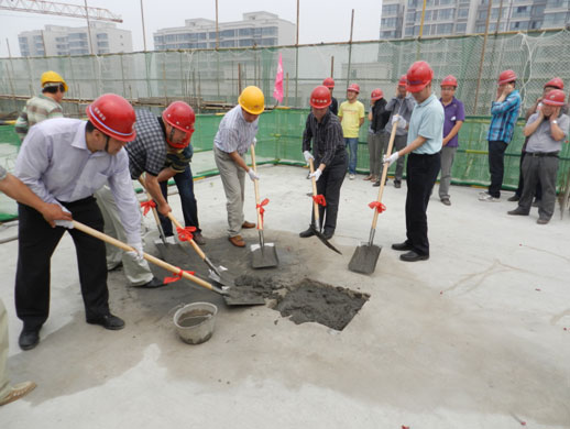 上午11:00由假日花城项目公司总经理詹望、总经理助理李春辉、工程部经理王正、西煤监理中心总经理张裕、宝天建设副总经理乌志明、宝天建设第八项目部项目经理高天恩共同为4.2期项目浇筑最后一罐混凝土,标志着4.2期6栋楼全部主体封顶。假日花城项目公司总经理詹望在封顶仪式上勉励大家:结构封顶只是工程施工中的第一小步,后续工程任务将会更加繁重,希望大家能够再接再厉,增强安全意识,加强质量与进度管理,确保给业主交一份满意的答卷。