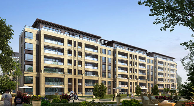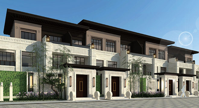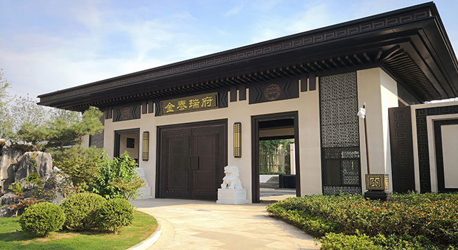 项目景观园林为新中式风格,采用中国传统的皇家造园方式,依照 “天人合一”的设计手法,采取四进制庭院的设计理念,打造极具仪式感的归家礼序。