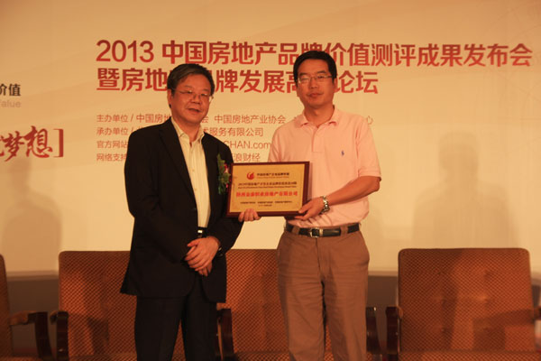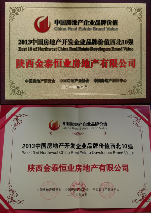 2013年9月17日,北京国贸中心,在2013中国房地产品牌价值测评成果发布会上,陕西金泰恒业房地产有限公司一举荣获“2013中国房地产开发企业品牌价值西北10强(第五位)”及“2013中国房地产开发企业品牌价值专业特色10强(科学地产)”双项殊荣。公司副总经理詹望代表公司出席了发布会并上台领奖。