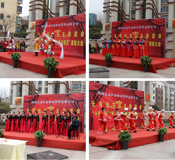 活动开始,物业公司副总经理刘冰、丝路花城物业服务中心主任王晓东,分别为26位业主颁发了“十佳居民”和“物业服务优秀监督员”荣誉证书。颁奖过后由丝路花城艺术团老年朋友带来的“走进新时代”拉开了本次元宵节文艺演出的序幕。本次文艺演出除了艺术团朋友们为大家带来的舞蹈外还有独舞《卷珠帘》、独唱《陪你一起看草原》等,社区业主王宝琴还特意为本次元宵活动准备了10人诗歌朗诵《为丝路花城点赞》,沁园业主宁老师为本此活动送上的书法贺词均得到了在场数百位业主的阵阵欢呼及一致好评。物业公司员工的舞蹈《醉春》、《激情火把节》更是把本次文艺演出活动推向了高潮。本次元宵佳节联谊会最终在一曲《没有共产党就没有新中国》的大合唱中落下了帷幕。