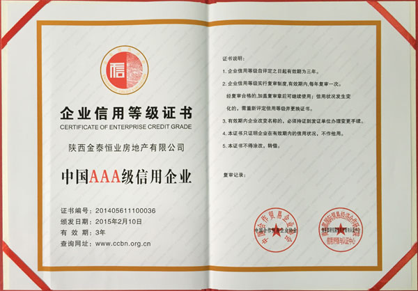 8月16日,在由中国合作贸易企业协会、商务部研究院信用评级与认证中心、中国企业改革与发展研究会、中国企业信用评价中心联合举办的2015中国企业科学发展大会暨颁奖盛典上,通过研究分析、科学评估、严格评定,陕西金泰恒业房地产有限公司被评定为“中国AAA级信用企业”、马亚鹏董事长被授“2014年度全国优秀诚信企业家”称号。