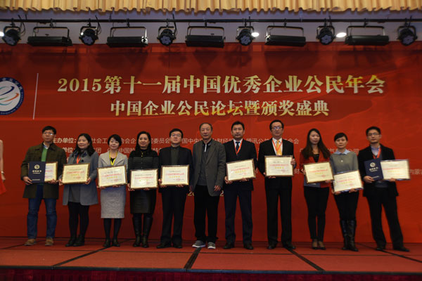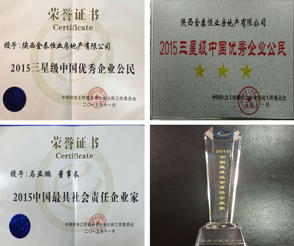 2015年11月28日,由中国社工协会企业公民委员会、中央电视台财经频道和腾讯公益慈善基金会共同主办的“2015第十一届中国优秀企业公民年会暨颁奖盛典”在京举行,我司以强烈的企业使命感和在履行社会责任方面的突出贡献,荣获“2015三星级中国优秀企业公民”奖,我司董事长马亚鹏被授予“2015中国最具社会责任企业家”奖荣誉,成为西部唯一获此殊荣的房地产企业。