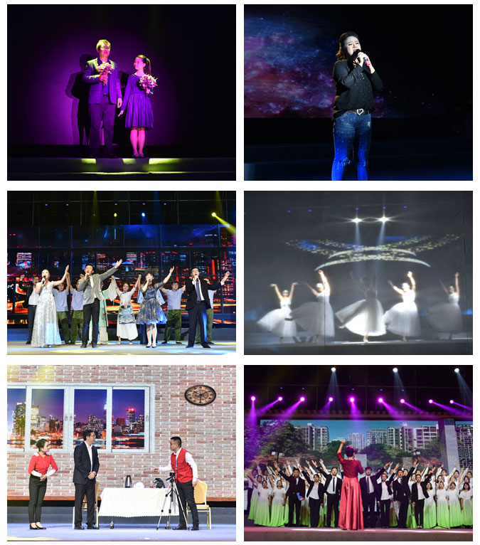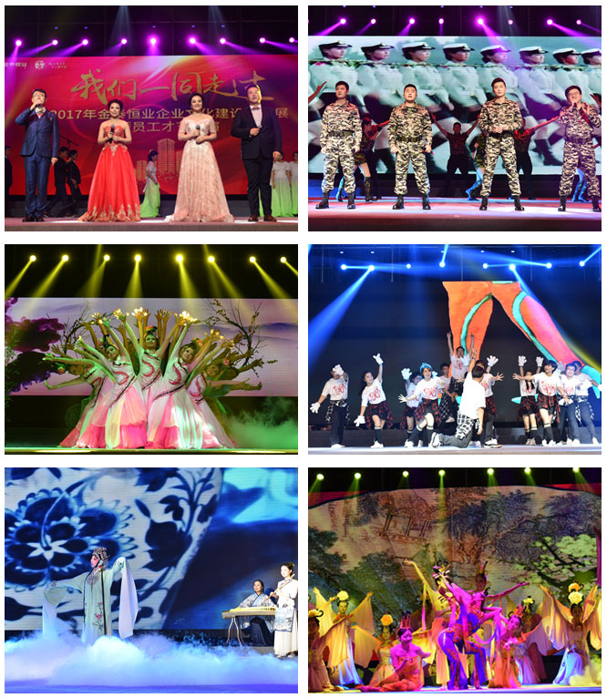 近两个小时的才艺汇演内容丰富、创意不断、完美展现了企业文化建设的成就与员工饱满的精神面貌:节目开始以金泰恒业十五年业绩展示视频完整真实的再现了企业十五年来的发展历程;接下来员工及家属合唱的《生日快乐》歌使整个会场充满了生日的温馨氛围、领导班子成员共同的生日祝词,让全场观众感受到了领导班子成员众志成城的凝聚力;节目《渴望光荣》表达了员工奉献企业,激情昂扬的工作热情;音画诗《我们一同走过》,舞台上演员们用饱满的情绪与语言文字讲述了企业的发展之路与员工的平凡故事,感染着台下的每位观众;歌曲串烧《我们的生活 我们的歌》为汇演锦上添花;汉中置业情景歌舞《青山秀水我的家》用歌伴舞的形式,表现了大美汉中之景。节目乐舞互动秀《high show 金泰》前半部分小清新民谣使人沉醉其中,后半部分high show舞蹈活力四射,引爆全场。员工小品《采访》讲述员工自己的故事,真挚感人又包袱笑料十足,引得台下阵阵笑声。《山记得住 水记得住》、《离不开你》男女独唱,唱功一流,获得台下一片掌声。3D音画舞《光耀三秦》运用先进的舞台灯光技术与优美的舞蹈结合,令人耳目一新,创意十足。大型舞蹈《千年之约》来自唐长安美女们的翩翩舞姿,让人仿佛穿越回几千年前。节目最后随着大合唱《金泰恒业之歌》、《二十年后再相会》歌声的响起,公司2017年金泰恒业企业文化建设成果展暨员工才艺汇演完美落幕。