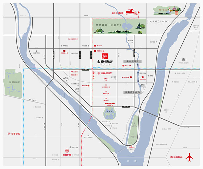 金泰瑞府位于临沂市北城新区南京路与孝河路交汇处东北角,东邻临沂第十二中学,北邻临沂第二实验小学明坡校区和临沂第一高级中学,交通便利,教育资源丰富,商业配套齐全,首创临沂府学别墅区先河。